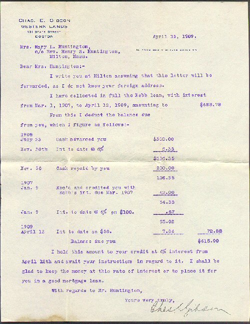 (1705) Letterhead - April 15, 1909 - Chas E. Gibson - Western Lands - Boston, MA. Condition: Very Good Letterhead measures 8 1/2" by 11" and has been folded. This typed letter gives information about a loan and was sent to Mary L. Huntington in Milton, MA. Mary was married to Reverend Henry Strong Huntington (1836 to 1920). Reverend Huntington was a Congregational Minister in New Hampshire, Illinois, Maine, and Massachusetts. A collection of his family's letters and papers is housed at the Yale University Divinity Library Special Collections. It is signed by Mr. Gibson. There is a record of a Chas E. Gibson Company in Boston in 1914 and a Charles E. Gibson who was commodor of Buck's Harbor Yacht Club in 1926 (Boston). Item # 1 of The HUNTINGTON GROUP