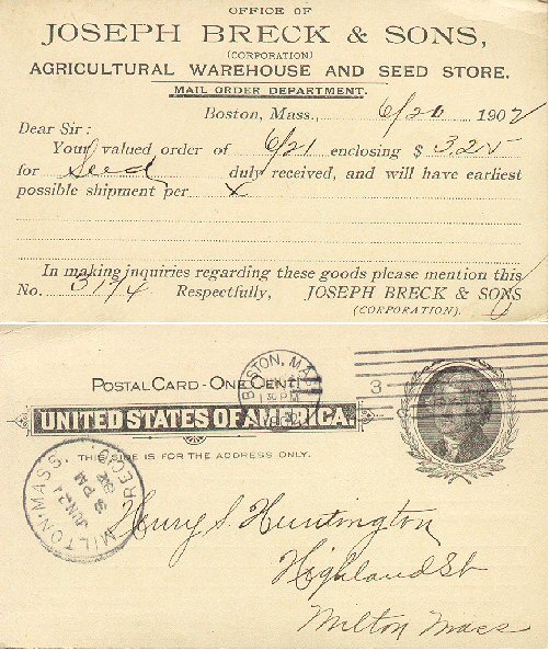 (1708) June 20, 1902 - Joseph Breck & Sons - Agricultural Warehouse and Seed Store - Boston, MA. Condition: Very Good. Postcard measures 5 1/2" by 3 1/4". G. The postcard was sent from the Mail Order Department to Henry S. Huntington on Highland St. in Milton, MA. It stated that Reverand's order and money for seed was received. Joseph Breck (1794-1873) was founder of the agricultural supply company that still exists today. Joseph Breck moved an experimental garden in 1854 to Nonantum Street in Boston. There are samples of his seed catalog from 1867 on the internet. This postcard dates to the time when the Sons of Joseph Breck were running the seed catalog business. Item # 4 of The HUNTINGTON GROUP