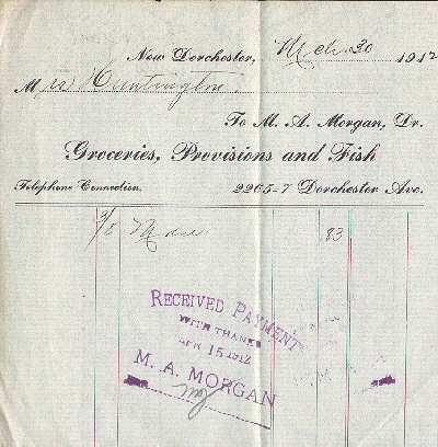 " March 30, 1912 - M. A. Morgan, Dr. - Groceries - New Dorchester, MA."