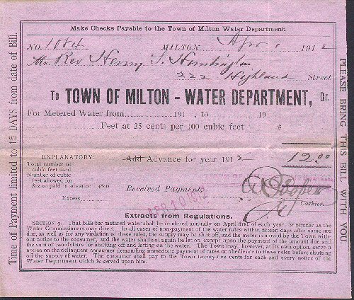 (1714) April 1, 1912 - Water Department - Milton, MA. Condition: Good Plus. Billhead measures 7" by 6" and has been folded. This bill from the Water Department was presented to Rev. Henry S. Huntinton at 222 Highland St. in Milton. The bill was for $12.00. Item # 10 of The HUNTINGTON GROUP