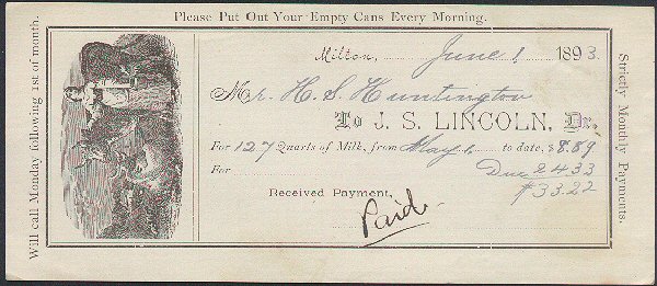 (1717) June 1, 1893 - J.S. Lincoln, Dr. - Milton, MA. Condition: Very Good. Billhead measures 7" by 3 3/4" and has a beautiful vignette on the left end. This bill is for 127 Quarts of Milk from May 1! The total bill was $33.22 and was sent to Mr. H.S. Huntington. It is interesting to note that this is dated the same year as the tax bill in Minnesota. This seems to be an extradinarily large milk bill - perhaps because of the large family (six children). Item # 13 of The HUNTINGTON GROUP