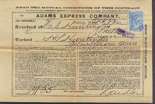(1718) October 22, 1900 - Adams Express Company - Boston, MA. Condition: Good. Billhead measures 8 1/4" by 5 1/2" and has been folded. This bill was presented to H. S. Huntington in New Haven, Connecticut. It dealt with transporting a parcel...but parcel was not described. Alvin Adams started in the express business in May of 1840 in Boston with a partner. For the first seventy-five years it was on e of the Nation's Leading Independent Express Comapnies. Item # 14 of The HUNTINGTON GROUP
