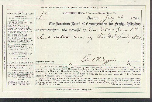 "July 26, 1897 - The American Board of Commissioners for Foreign Missions - Boston, MA."