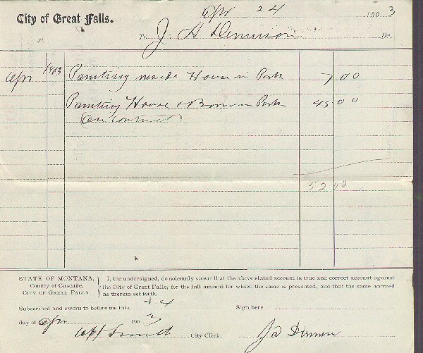 (1721) May, 1906 (and April 19 - Official Payment Request - City of Great Falls, Montana. Condition: Very Good Document measures 8" by 7" (unfolded). Was an official request for the city to pay $52.00 to J. A. Dennison for services to the city. It looks like he painted a house in the city park. There are two dates on the document. One is April of 1903 the other is May of 1906. In 1906 the Great Falls Amusement Park opened and a light rail line was built from Georgetown to Great Falls. St Ann's Cathedral was constructed during that year, and Great Falls men won the Montana Football Champaionship!