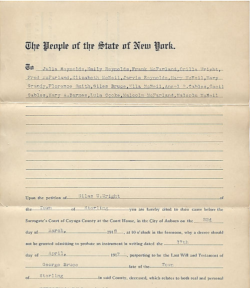 (1865) February 2, 1919 - Citation - Cayuga Surrogate's Court - New York. Condition: Very Good Citation measures 8 1/2" by 13 1/2". The citation was presented to a large list of relatives of George Bruce by Silas W. Wright. It was in reference to the last will and testament of Mr. Bruce. This paper is marked as a copy. Note: part of the citation was not scanned. This part contains the names of the Attorney for the Pettioner (M. F. Millard) and the Clerk of the Court (James F. Rich) Price: $10.00 + shipping