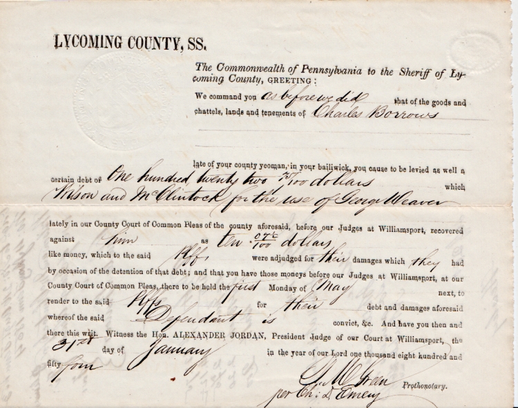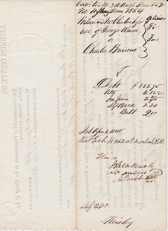 (1975) January 21, 1854 - A request from Lycoming County to the Sheriff. Condition: Very Good Document measures 7 1/2" by 6" (unfolded). This was a demand that the sheriff that he complete a task which involved a man named Charles Burrows who evidently was in debt for the sum of $172.75. As far as I can tell, the sheriff was responsible for getting this gentleman to court. Other names on the document were Wilson and McClintock. The paper was signed by a Mr. Green who was the Prothonotary. (Chief Clerk of the Court). There is another signature that I cannot read. On the back it mentions this debt for the use of George ______. Charles Burrows is buried at Pennsdale Cemetery