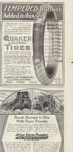 (331)ADVERTISEMENT: Quaker Tires -1913-Condition: Good B&W ad measures 4 1/2" by 6". It has a large illustration of a Quaker Tire with outer layer sliced away. The Caption reads "Tempered Rubber Added to This" It then labels the different layers of the tire. Also includes Atlas Farm Powder Ad below, and Fairy Soap Ad on the Back. Price: $3.00 + shipping.