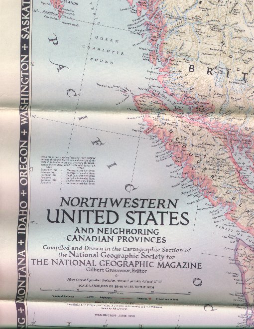 (1059) National Geographic - June 1950 - Supplement Map - Northwestern US and Canadian Provinces. - Condition: Very Good. Detailed map showing the Northwestern States of the US including parts of Canada. Map folds out to: 36" by 25". Price: $5.00 + shipping.