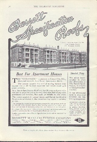 (1299b) ADVERTISEMENT: Barrett Specification Roofs. - 1912 American Magazine. - Condition: Very Good B&W; Full Page 7" x 10". Wonderful picture of the "Colonade" and apartment complex in Kansas City, Missouri. Ad was for the Barrett manufacturing Company who supplied the roof for the apartments. A wonderful example of apartment living in 1912! Note** Number 1299 is on the back. Mellin's Baby Food. Price: $5.00 + shipping.