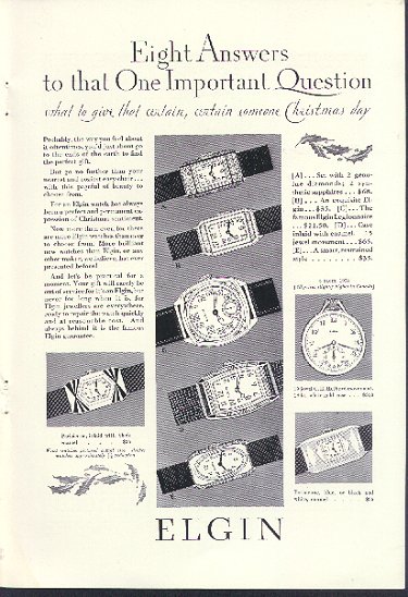 (1353) ADVERTISEMENT: Elgin Watches. - 1928 National Geographic. - Condition: Very Good B&W; Full Page 6 3/4" x 10". Shows eight different watches (men's and women's). Mentions they are wonderful gifts. Note** Number 1353b is on the back. Eveready Prestone Anti-Freeze - Dirigible. Price: $4.00 + shipping.